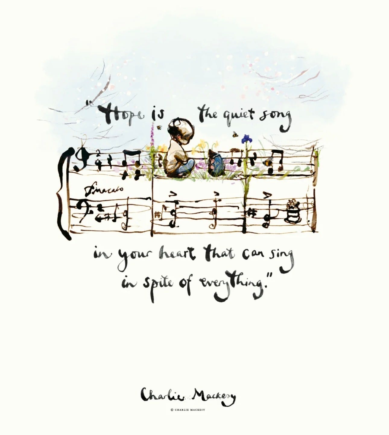 Charlie Mackesy captures this beautifully: “Hope is the quiet song in your heart that can sing in spite of everything.” And when doubt creeps in, I remind myself of another of his insights: “Sometimes, all you hear about is the hate, but there is more love in this world than you can possibly imagine.”